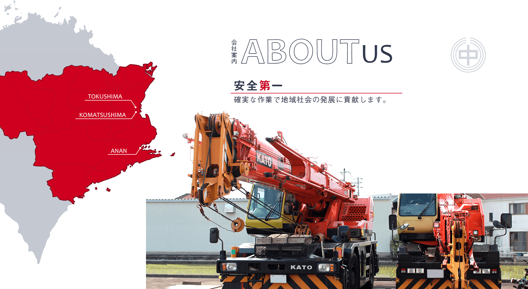 徳島市を拠点とする有限会社中川組は、移動式クレーン車による搬入・重量物吊り下げ・運搬など揚重作業一式を請け負う専門事業者です。